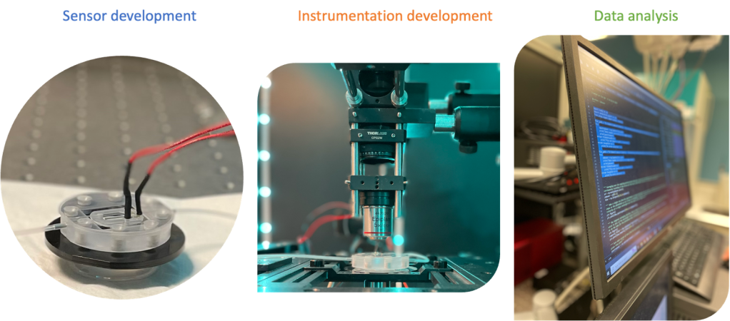 We develop novel methods from initial sensing concepts to demonstrating innovative applications in biology, electrochemistry, and materials. This process involves sensor development using the state-of-the-art nano/micro fabrication technology. To achieve this, we exploit various charge sensitive optical phenomena including surface plasmonics. Our lab builds precision optical measurement systems along with customised data analysis techniques to maximise information extraction. Additionally, we conduct theoretical research that integrates physical chemistry models of electrified media with various optical models to understand charge carriers and light interactions. Our methods are demonstrated using living system models spanning the range of a single cell to a whole living organism.
